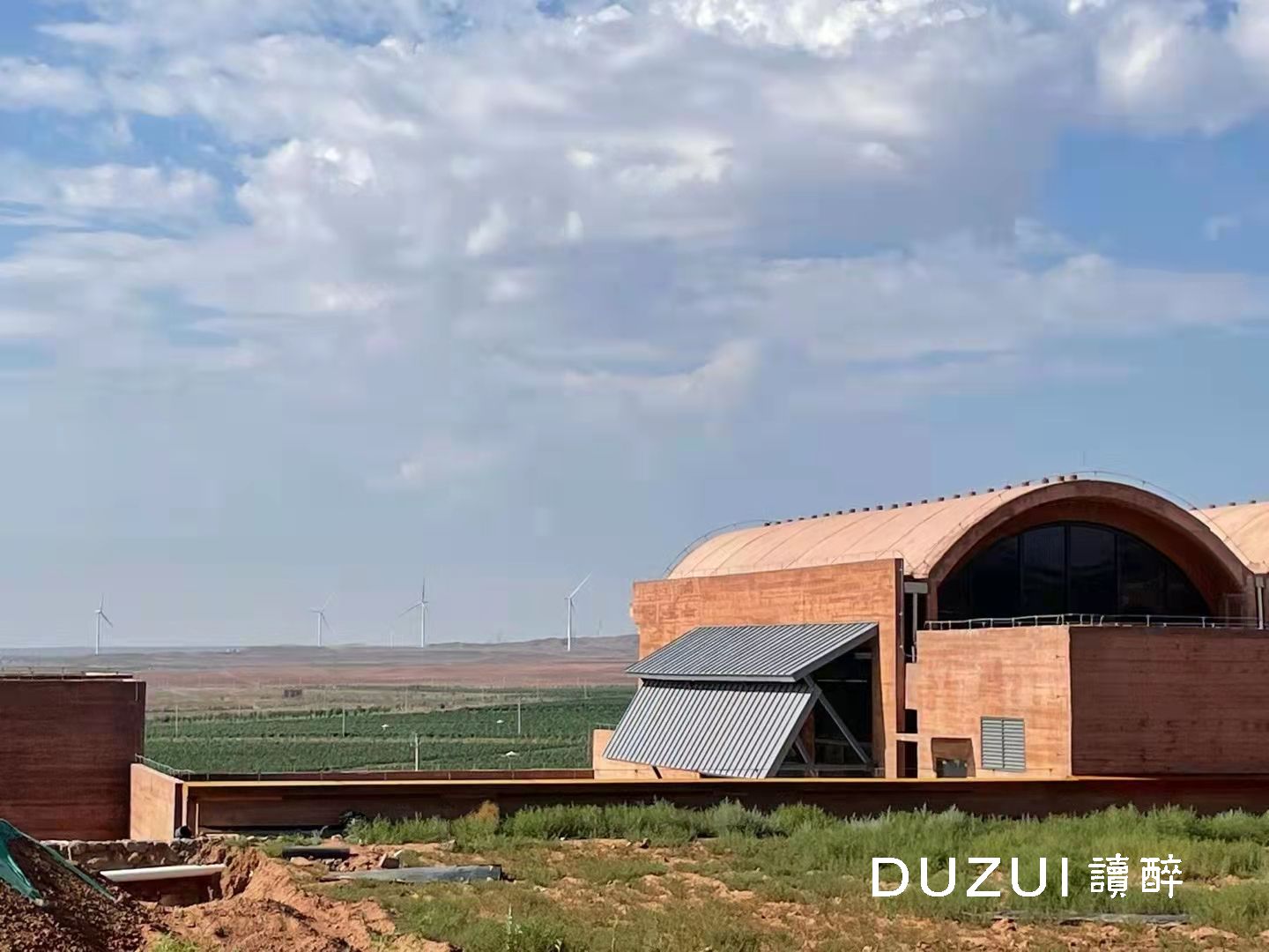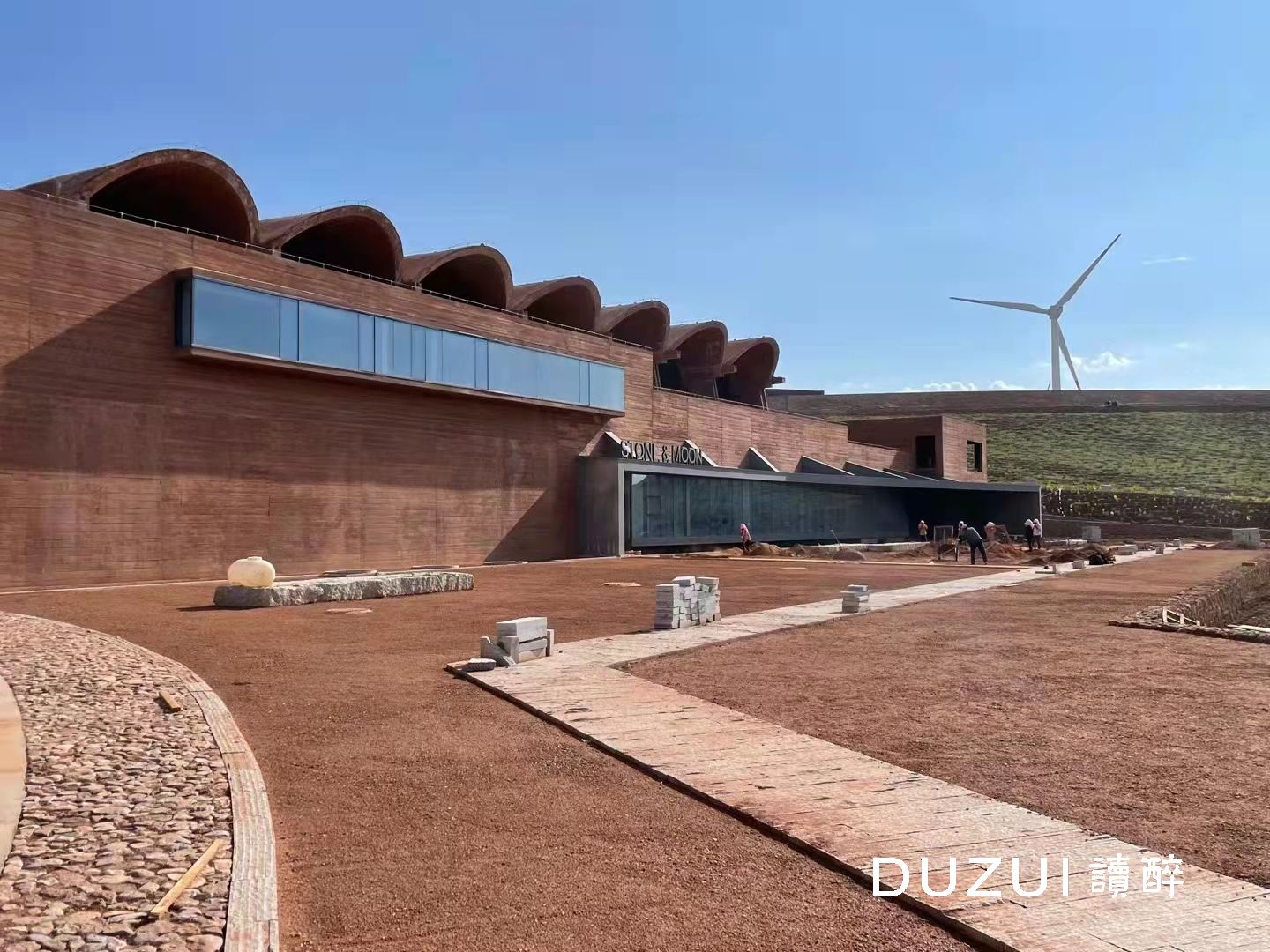 望月石酒庄的建筑采用调色清水混凝土工艺,一次性浇筑完成,是中国最大面积的调色清水混凝土单体建筑。酒庄将建筑美学与结构科学相融合,棱角分明的建筑与当地山体融为一体,硬朗的建筑线条与戈壁滩遥相呼应。